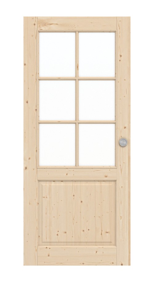 Skrzydło drzwiowe ma w górnej części świetlik z drewnianymi szprosami, które dzielą otwór na sześć kwadratów. Poniżej znajduje się prostokątna wypełniona część. Profilowany fryz drzwiowy dodaje dodatkowy akcent w stylu wiejskim.