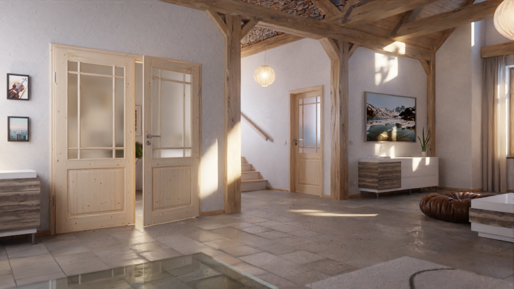 Oświetlenie i otwarta atmosfera zapewniają dwa duże okna świetlne. Każde z nich jest podzielone na dziewięć pól przez ramę z przęsłami, które w różnych rozmiarach stanowią interesujący i elegancki element dekoracyjny. Pod nimi znajduje się mniejsza kaseta, a profilowany fryz drzwiowy podkreśla wiejski klimat.