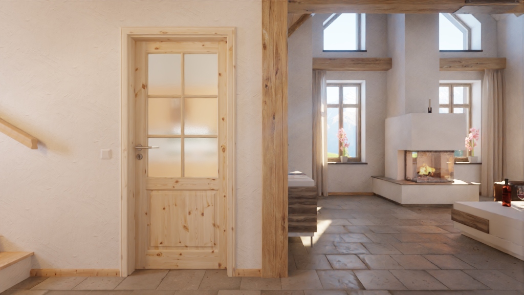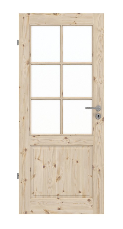 Górny obraz skrzydła drzwiowego ma przeszklenie ze szprosami drewnianymiktóre dzieli wycięcie na sześć kwadratów. Poniżej występuje prostokątne wypełnienie. Profilowana listwa drzwiowa nadaje dodatkowy akcent stylu wiejskiego.