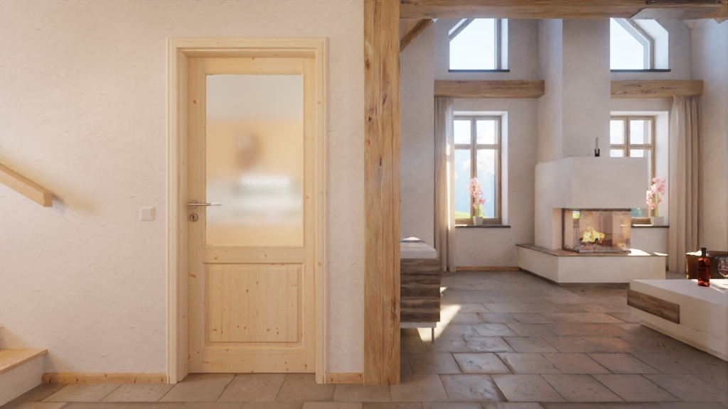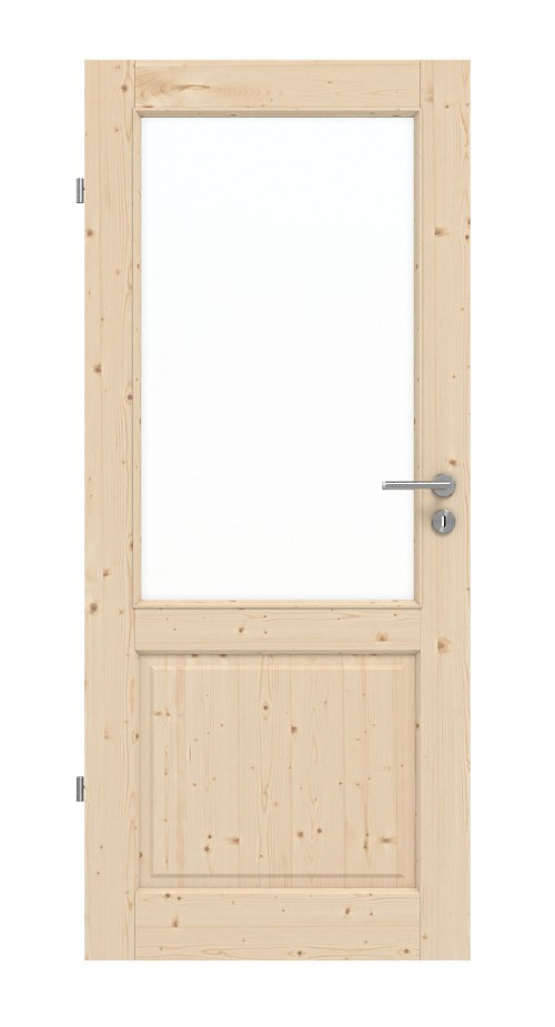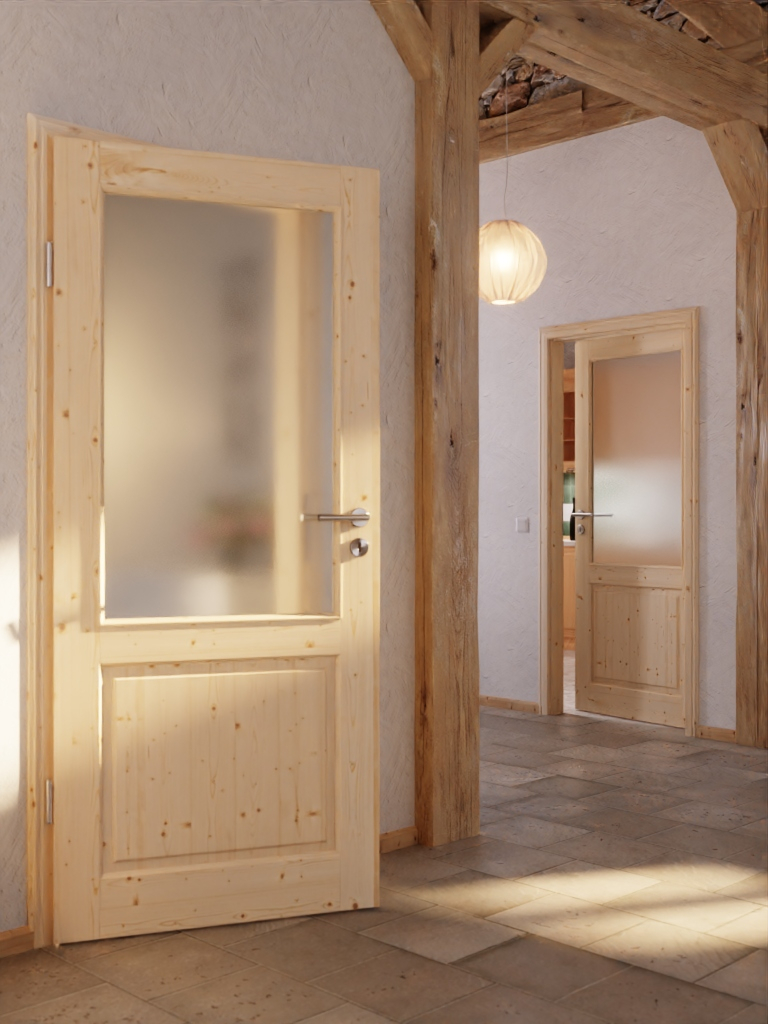 Duży przeszklony otwór zdobi górną część skrzydła drzwi, wpuszczając światło do pomieszczenia. Poniżej znajduje się prostokątne, mniejsze wypełnienie. Rustykalny wygląd uzupełnia profilowana rama drzwi.