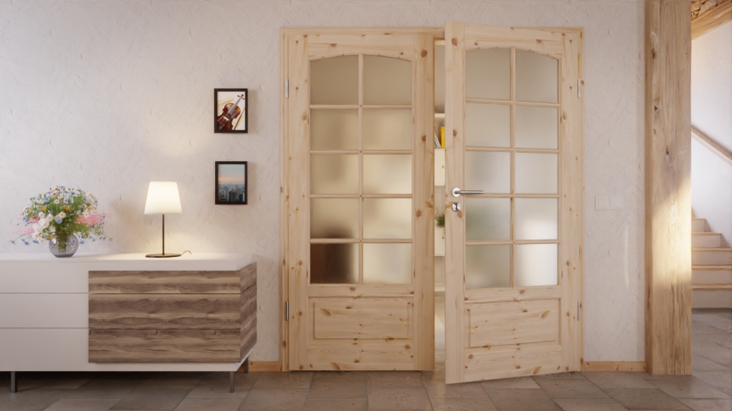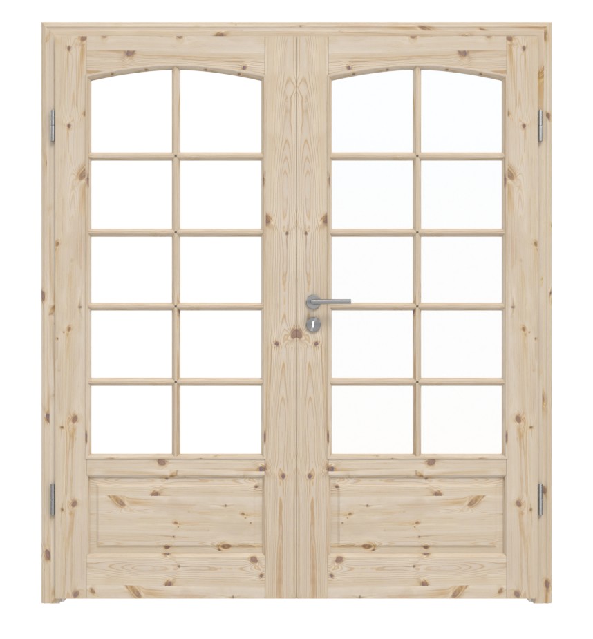 Z dwoma okazałymi przeszkleniami, w podziale na dziesięć kwadratów, drzwi dwuskrzydłowe są charakterystycznym elementem mieszkaniowym. Delikatne łuki w górnej części skrzydeł drzwiowych podkreślają ich przytulny charakter. Poniżej znajduje się wąskie wypełnienie. Profilowana listwa drzwiowa harmonijnie nawiązuje do stylu wiejskiego.
