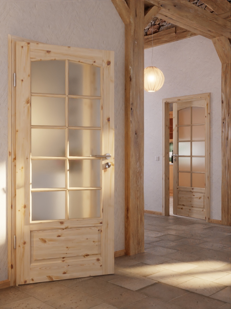 Skrzydło drzwiowe jest na górnym końcu zagięte i dzieli się na dziesięć przeszkleń o tej samej wielkości, które są oddzielone drewnianymi szprosami. Pod spodem znajduje się wąskie, wzdłużne wypełnienie. Profilowana listwa drzwiowa dopełnia spójny styl wiejski drzwi wewnętrznych.
