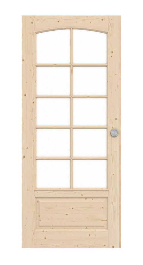 Duży otwór świetlny dzieli się na dziesięć równych pól, które oddzielają drewniane listwy. Na górze skrzydło drzwi ma stylowy, falisty łuk. Na dole wąska, pozioma wypełniona część dopełnia harmonijny wygląd. Idealnym uzupełnieniem wiejskiego stylu jest profilowany fryz drzwiowy.