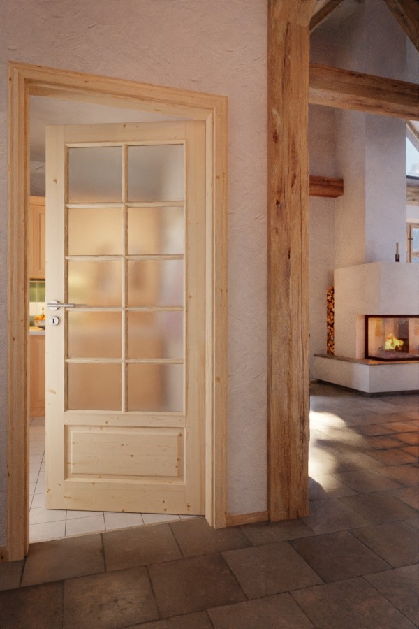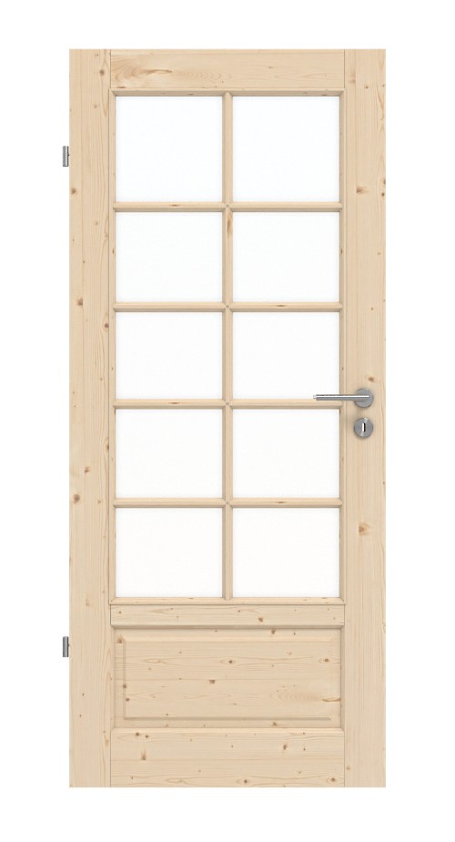 Skrzydło drzwi dzieli się na dziesięć kwadratowych przeszkleń, oddzielonych drewnianymi szprosami. Dzięki temu do Twojego pomieszczenia wpada więcej światła. Pod nim znajduje się poziome wypełnienie. Profilowany fryz drzwiowy dopełnia wiejski styl drzwi wewnętrznych.