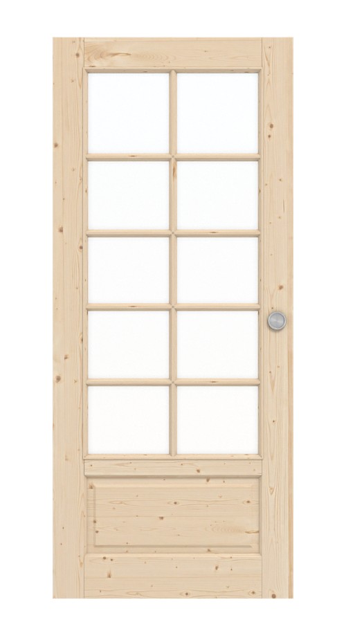 Drzwi dzielą się na dziesięć kwadratowych otworów świetlnych, oddzielonych drewnianymi listwami. Dzięki temu do Twojego pomieszczenia wpada więcej światła. Dwie poziome wypełnienia znajdują się poniżej. Profilowany fryz drzwiowy dopełnia wiejski styl drzwi przesuwnych.