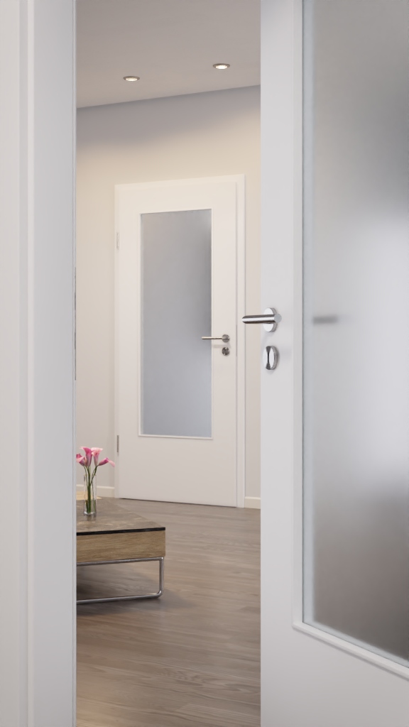 Jakość marki i atrakcyjne ceny: Dzięki swojej mocnej i żywej powierzchni drzwi wewnętrzne CPL DuriTop z serii Optima firmy Jeld-Wen pokazują, jak mogą wyglądać dekoracje w kolorze ultrabieli z wycięciem na szybę.