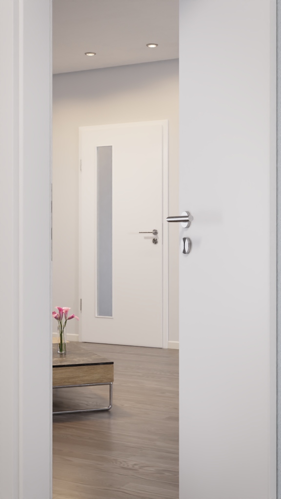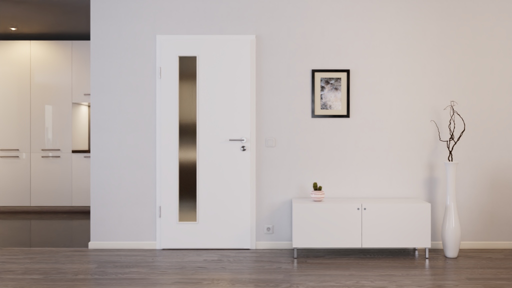 Idealny stosunek ceny do jakości: Drzwi wewnętrzne CPL DuriTop z serii Optima firmy Jeld-Wen zachwycają swoim olśniewającym i przekonującym dekorem w kolorze ultrabieli oraz przeszkleniem.