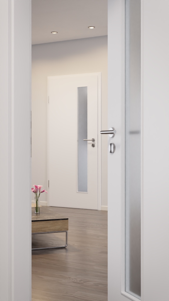 Jakość marki w przystępnej cenie: Te drzwi wewnętrzne CPL DuriTop z serii Optima są imponującym przykładem tego, jak mocne i żywe mogą być dekoracje w kolorze ultrabieli w połączeniu z listwą szklaną.