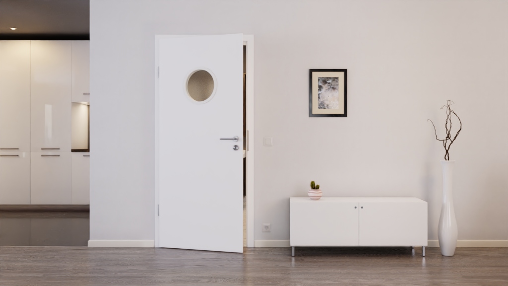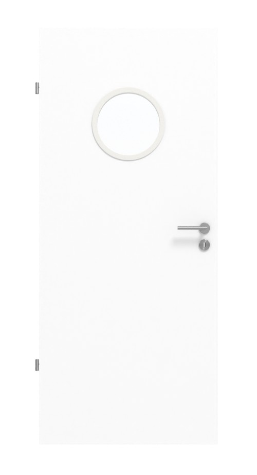 Wysokiej jakości drzwi pokojowe Optima w kolorze ultrabieli (RAL 9003) z otworem typu bulaj