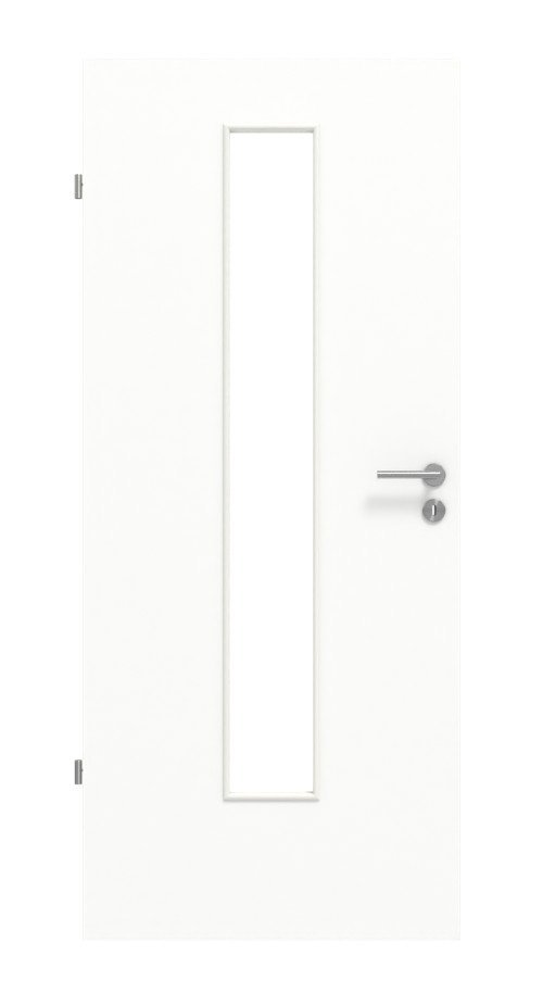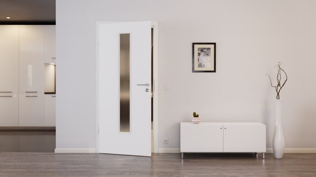 W środku białego skrzydła drzwiowego znajduje się wąski wycięty fragment szkła . Zapewnia to otwartą i jasnąatmosferę w pomieszczeniu mieszkalnym. Jedwabiście matowa powierzchnia przekonuje przyjemnym wyglądem.