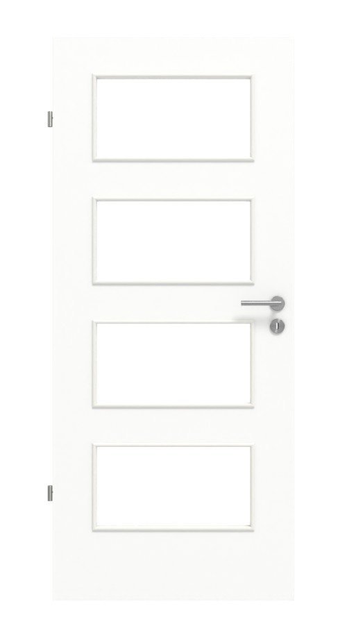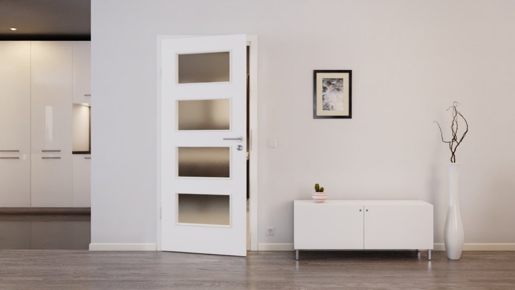 W białym skrzydle drzwiowym osadzono cztery prostokątne powierzchnie szklane , które zapewniają wyjątkowo otwartą atmosferę w Twoim domu. Dzięki wysokiej odporności na zabrudzenia możesz długo cieszyć się satynowo-matowym wyglądem.