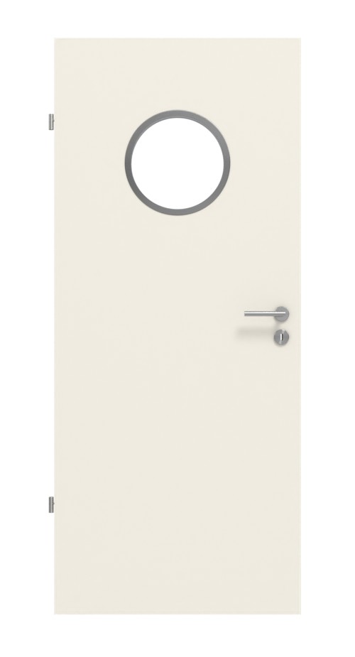 okrągły otwór świetlny w górnej części skrzydła drzwiowego