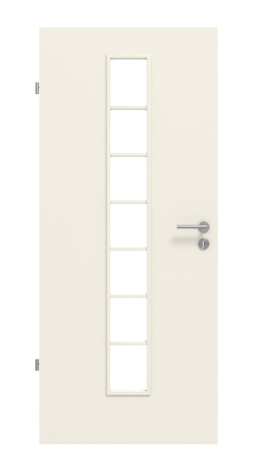 Kwadratowe przeszklenie z nałożonymi listwami szklanymi tworzy nowoczesną atmosferę. Charakteryzuje się centralnym umiejscowieniem. Wydłużone otwarcie umożliwia widok na całą wysokość drzwi. Nałożone listwy nadają atrakcyjny wygląd. Dodatkowo, szkło dekoracyjne podkreśla różnorodność rodzajów szkła (przezroczyste i piaskowane). Siedem kwadratów oddzielonych listwami tworzy interesującą atmosferę. Kolorystyka drzwi znajduje odzwierciedlenie w listwach szklanych i listwach.