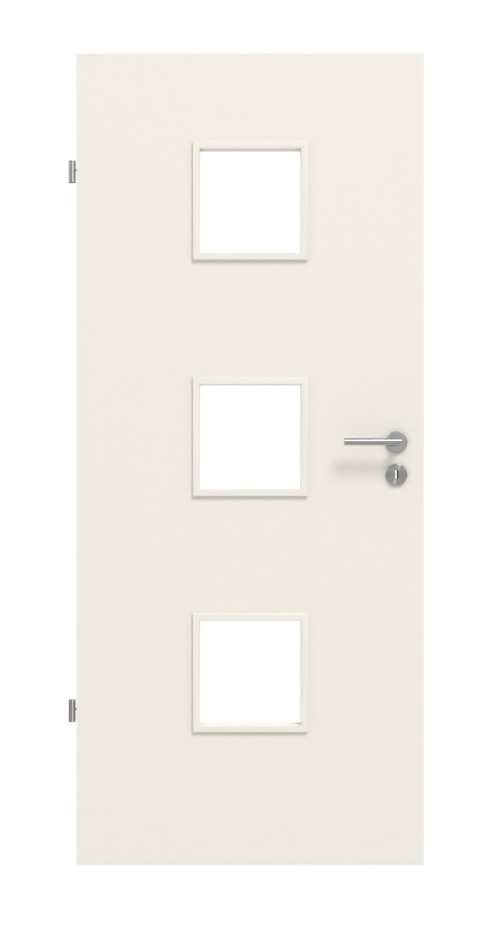 Kwadratowe przeszklenie z nałożonymi listwami szklanymi tworzy nowoczesną atmosferę. Jako trzy nałożone na siebie przeszklenia zdobią środek Twoich drzwi wewnętrznych, dodając im żywotności. Rozmieszczenie spełnia również trzy ważne funkcje: zapewnia wystarczającą ilość światła, możliwy widok na zewnątrz oraz ochronę dolnej części drzwi przed uszkodzeniami.