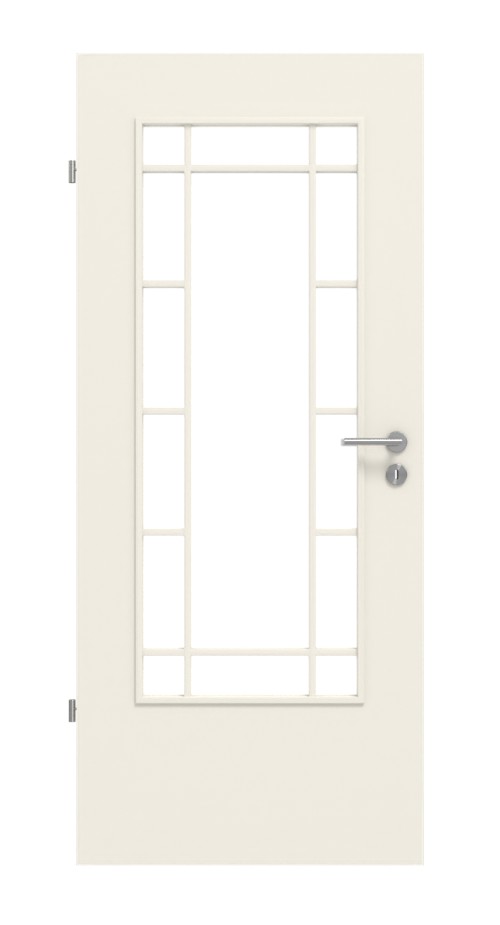 Prostokątne okno świetlne z nałożonymi listwami szklanymi wprowadza nowoczesny klimat. Dzięki podwyższonej obróbce szkło jest chronione przed uszkodzeniem, co czyni je idealnym do wynajmowanych obiektów. Stylowy design uzyskuje dzięki nałożonym szczeblinom. Wydanie szklane umożliwia dzięki układowi szczeblin ramę: małe kwadraty i prostokąty urozmaicają dużą otwartą przestrzeń pośrodku. Od przezroczystego szkła po satynowe, każdy znajdzie odpowiednie szkło dla siebie. Listwa, szczebliny i drzwi mają ten sam kolor.