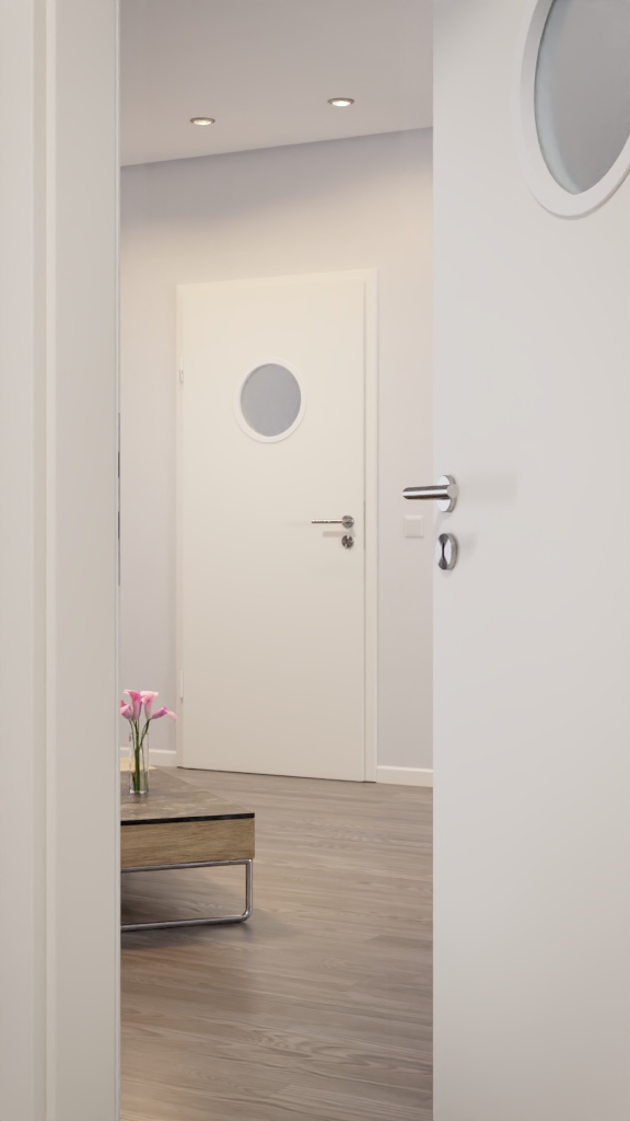 Imponująca cena i jakość marki: Te drzwi wewnętrzne CPL DuriTop z serii Optima firmy Jeld-Wen, charakteryzujące się mocnym i żywym wyglądem, pokazują, jak efektowne mogą być wykończenia lakierowane w kolorze bieli Uni w połączeniu z wycięciem na szybę.
