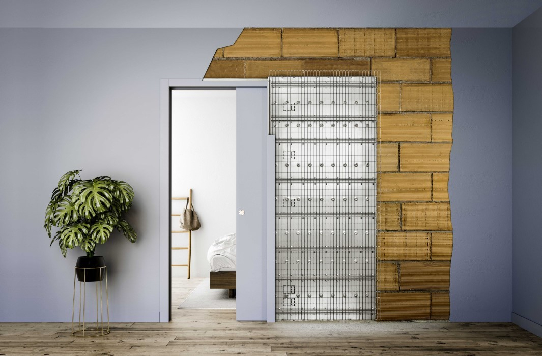 System drzwi przesuwnych jest przeznaczony do montażu drewnianych drzwi przesuwnych w budownictwie tradycyjnym. Ten model wymaga obudowy z boku.