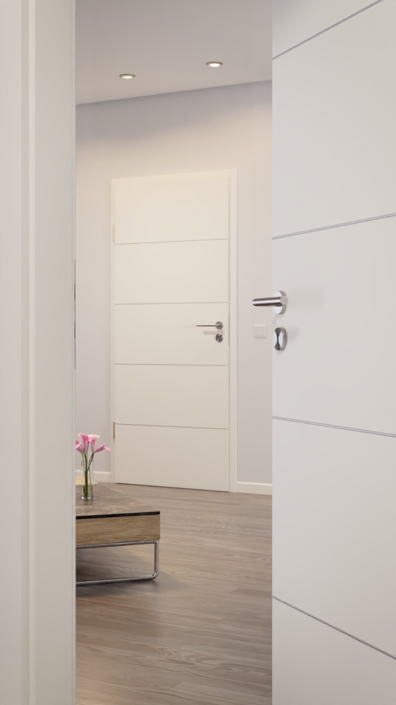 Wbudowane, srebrne listwy, które biegną w poprzek skrzydła drzwi, nadają przytulny charakter. Lekko wystają i tworzą stonowany akcent w designie. Wewnątrz wykonane z rurówki, powierzchnia pokryta jest wysokiej jakości białą lakierą.