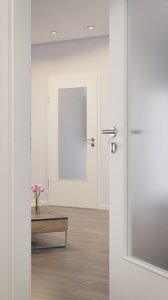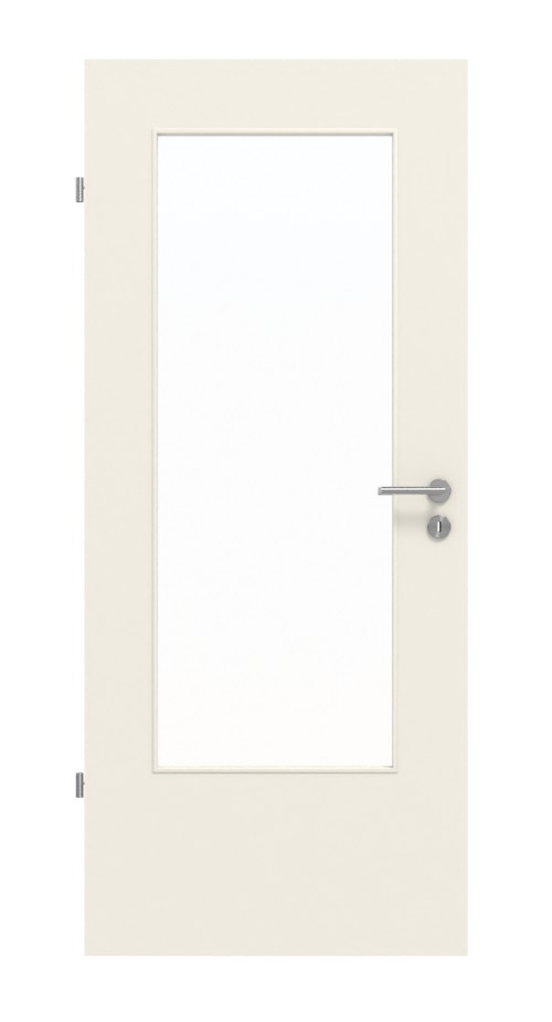 Stonowany wygląd tworzy przede wszystkim gładkie skrzydło drzwiowe oraz prosty otwór na światło. Nałożone listwy elegancko obejmują wypełnienie z przezroczystego szkła. Za dodatkową opłatą można wybrać inne rodzaje szkła.