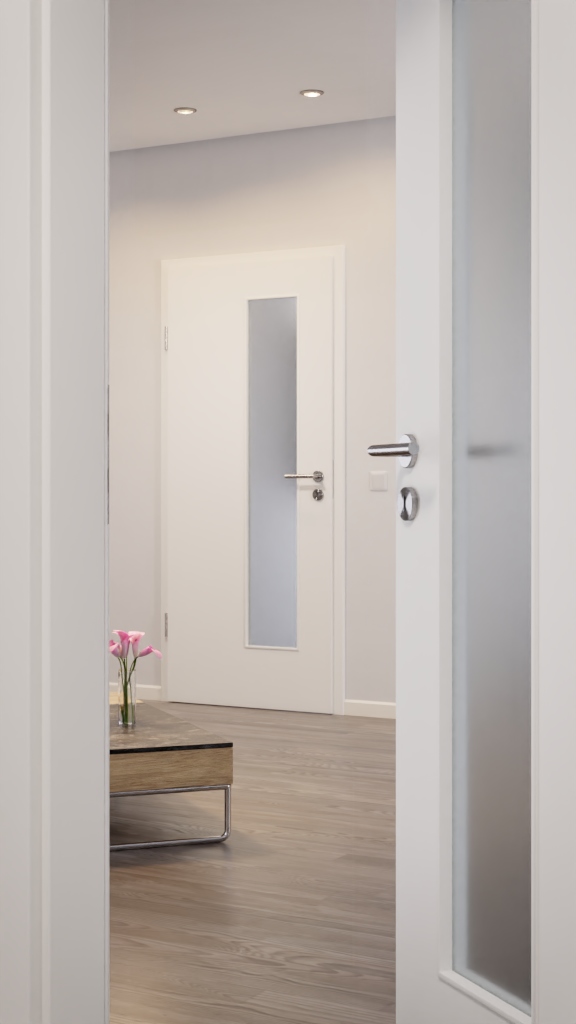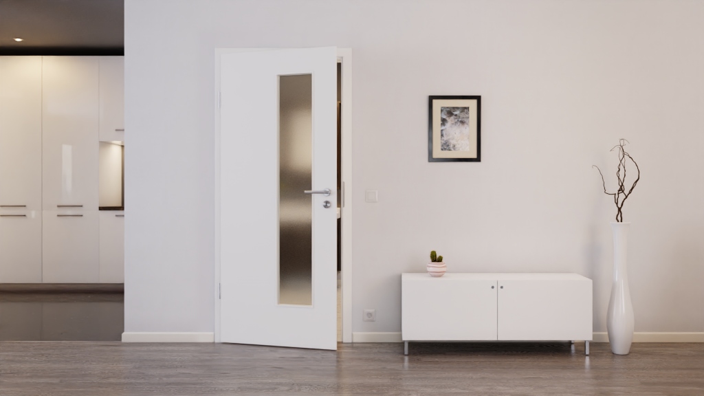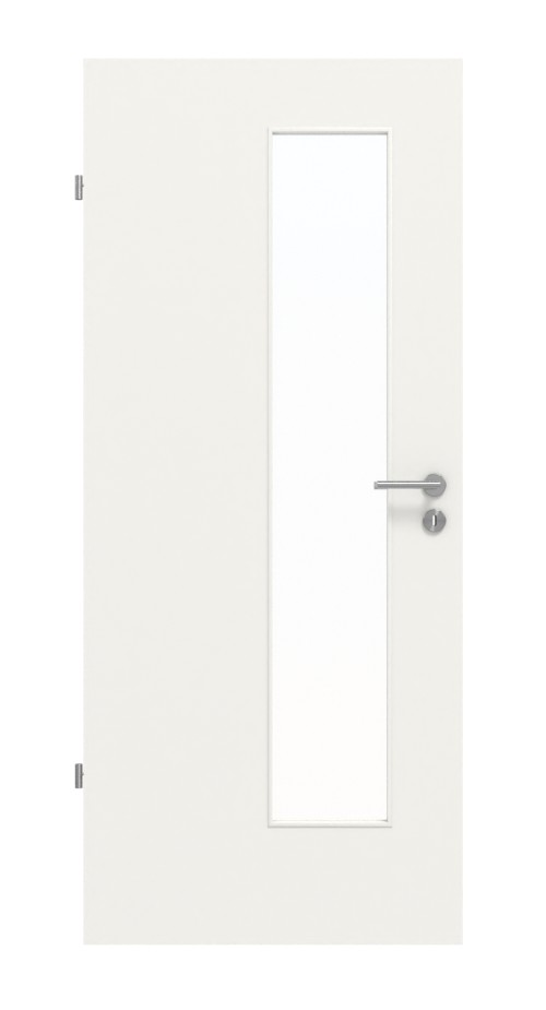 Idealne drzwi na co dzień: Równomierny i prosty wygląd drzwi wewnętrznych w kolorze białym 9016 od renomowanego producenta Lebo. Prostokątny wycięcie na szkło zapewnia większą przejrzystość między pomieszczeniami. To prawdziwe wyróżnienie!