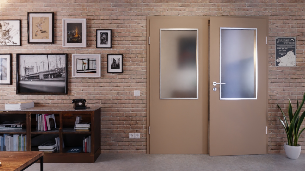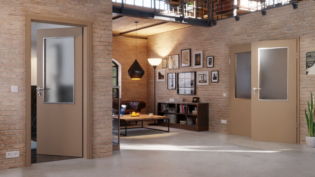 Nowocześnie zaprojektowane drzwi z płytą wiórową otworową wewnątrz: