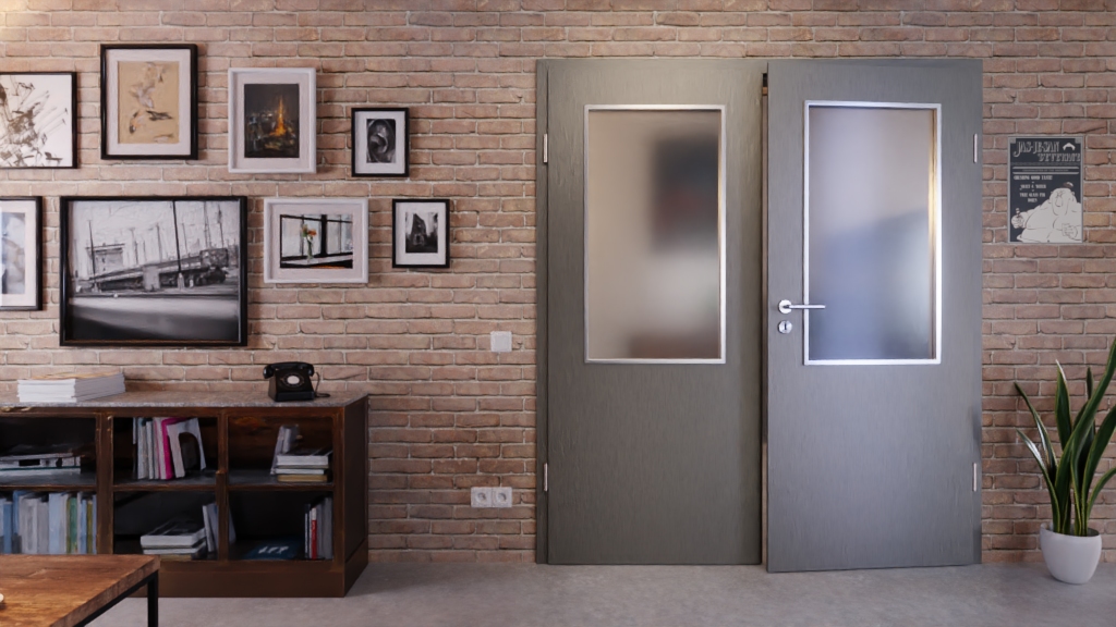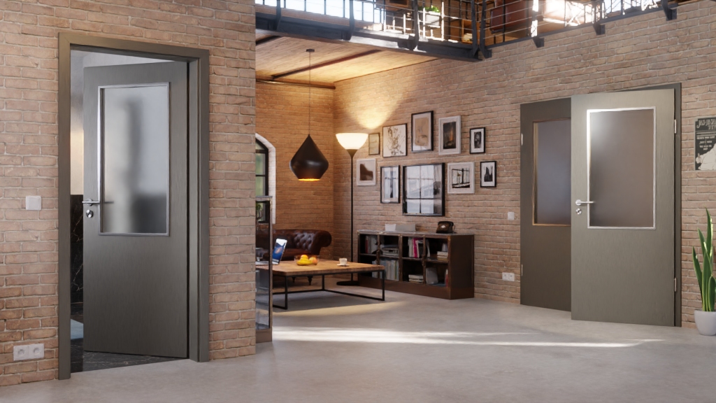 Nowocześnie zaprojektowane drzwi z płytą wiórową otworową wewnątrz: