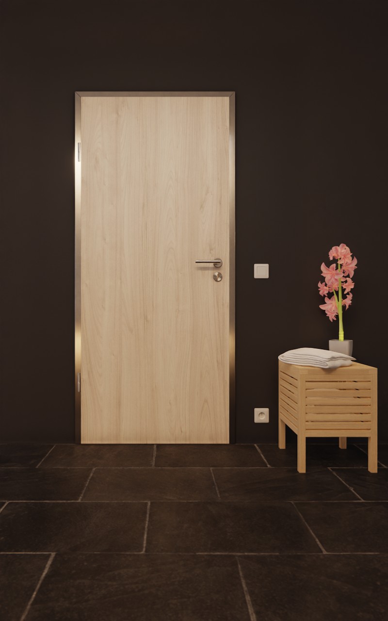 Drzwi są odporne na codzienne uderzenia dzięki rurkom wzmocnionym i 3 mm grubej płycie wierzchniej. Certyfikat RAL potwierdza, że drzwi wewnętrzne są odpowiednie do pomieszczeń wilgotnych. Bezpieczne mocowanie w ramach zapewniają również odporne na wilgoć stalowe zawiasy.