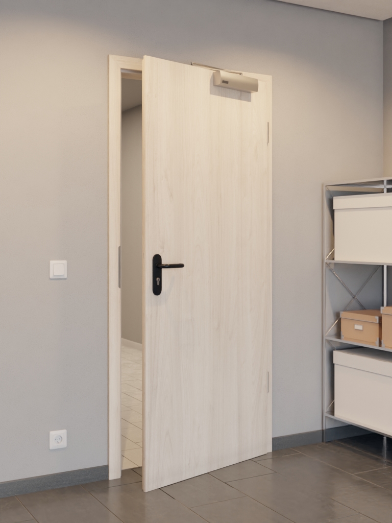 Wewnątrz skrzydła drzwi znajduje się specjalna wkładka. Aby dym nie stał się zagrożeniem w przypadku pożaru, w zestawie znajdują się zamykacz górny oraz obniżana uszczelka podłogowa. Dodatkowo w standardzie znajduje się zamek cylindryczny oraz zestaw klamek przeciwpożarowych.
