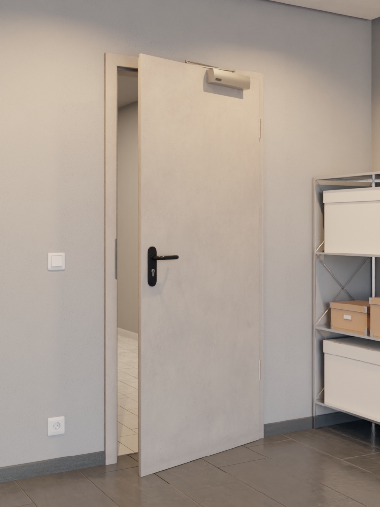 Dzięki specjalnej wkładce, zamkowi górnemu i opadającej uszczelce podłogowej w przypadku zagrożenia dym nie przenika przez drzwi. W skład dostawy wchodzi również zamek cylindryczny oraz zestaw klamek przeciwpożarowych.
