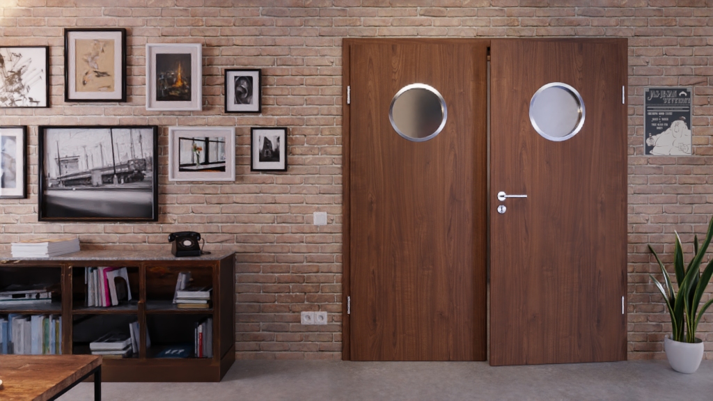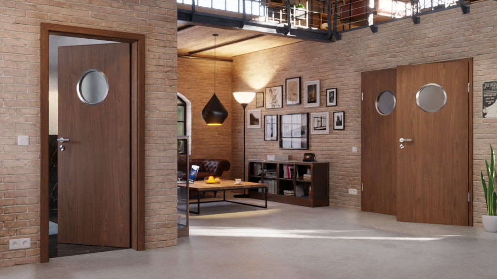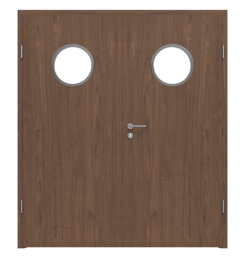 Ciemne wykończenie orzecha nadaje modelowi naturalny wygląd, który dzięki odporności na zarysowania i uderzenia pozostaje zachowany przez długi czas. Łatwą pielęgnację zapewnia odporność na środki czyszczące i wilgoć. W górnej części skrzydła drzwi znajduje się okrągłe okno świetlne.