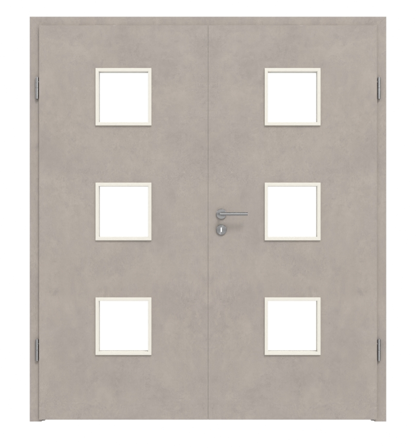 Szare dekory drewniane są odporne na zarysowania, promieniowanie UV i ścieranie. Odporność na kolory, temperaturę i rozpuszczalniki zapewnia łatwą pielęgnację. W skrzydle drzwiowym znajdują się trzy prostokątne okna świetlne.