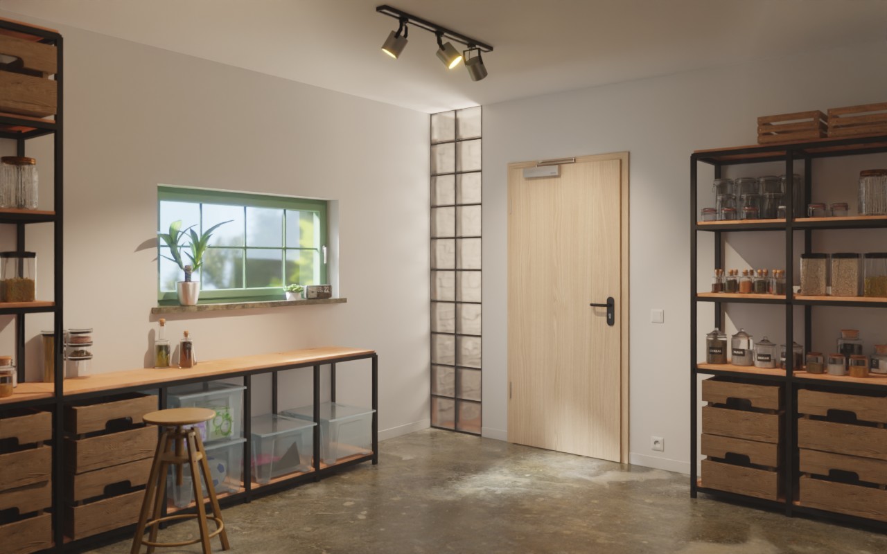 Sprawdzona drzwi przeciwpożarowe z odpowiednią klamką i zamkiem górnym: