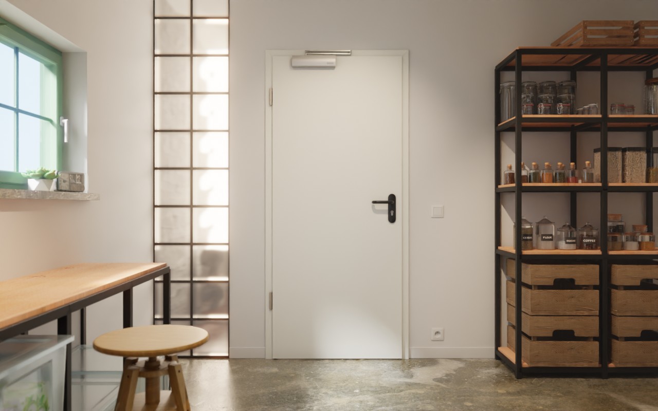 Wytrzymałe drzwi funkcyjne w kolorze sira biały z samozamykaczem drzwiowym górnym