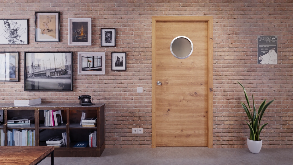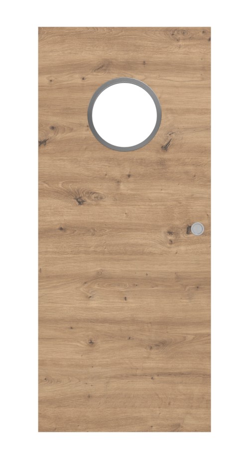 Dzięki pierścieniom rocznym i sękom, brązowe wykończenie CPL uzyskuje autentyczny wyraz. Łatwa pielęgnacja zapewnia wysoką odporność na rozpuszczalniki i wilgoć. Okrągłe okno szklane w górnej części drzwi przypomina bulaj statku.