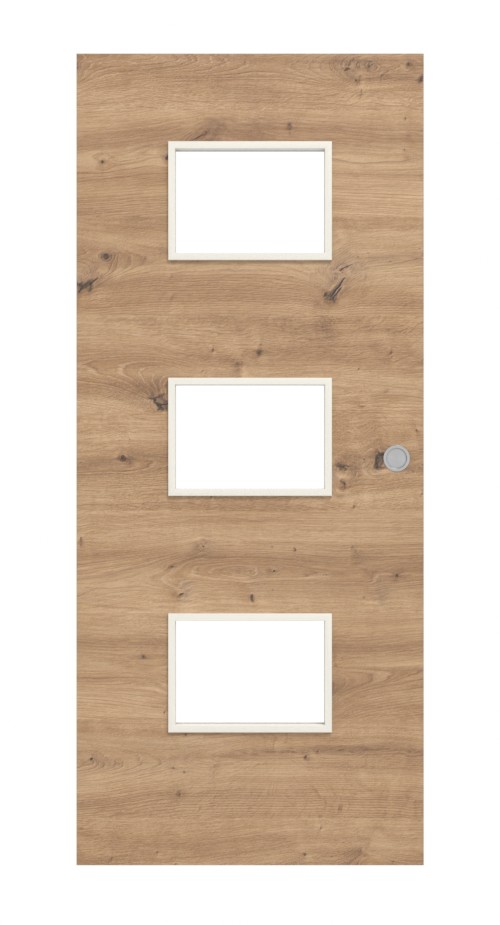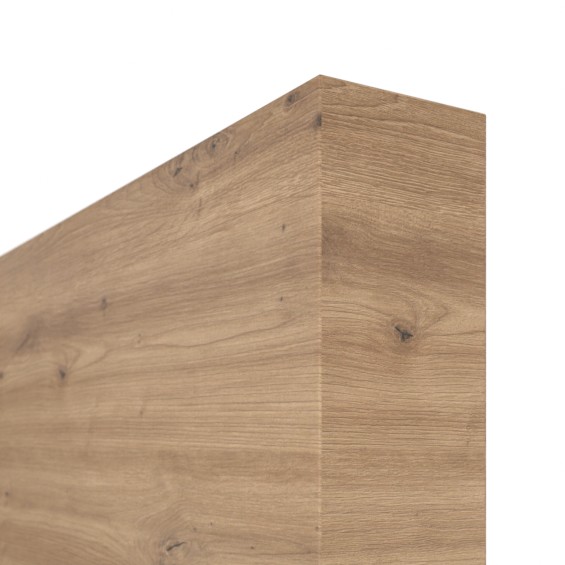 Brązowa okleina CPL charakteryzuje się dużymi sękami i wyraźnymi liniami rocznymi. Dzięki wysokiej odporności na rozpuszczalniki i wilgoć codzienna pielęgnacja jest prosta. Trzy przeszklenia nadają modelowi przejrzystości.