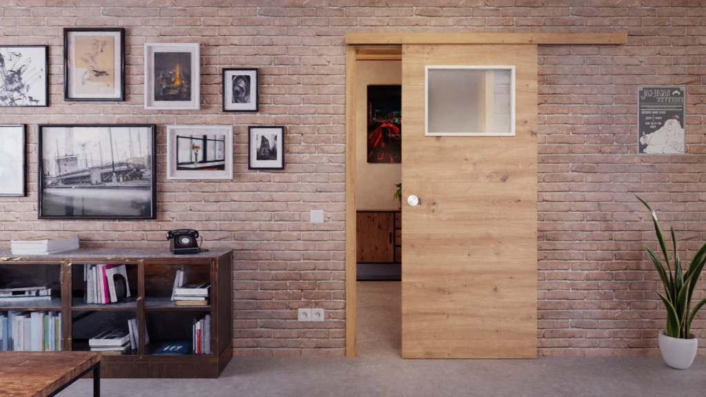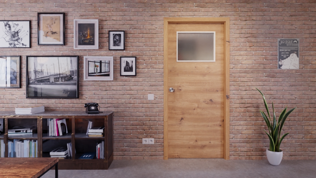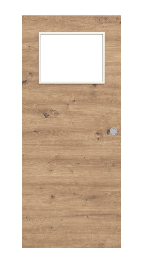Brązowy dekor CPL przypomina drewno dzięki liniom słojów i sękom. Aby łatwo usunąć codzienny brud, jest odporny na rozpuszczalniki i wilgoć. W górnej części skrzydła drzwi znajduje się prostokątny otwór szklany.