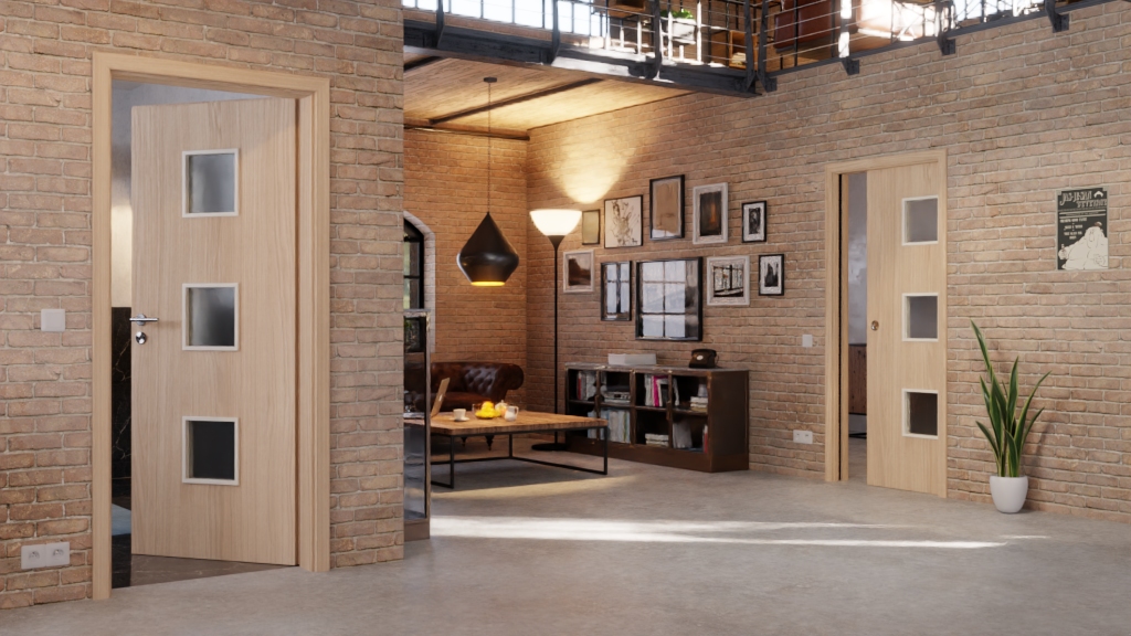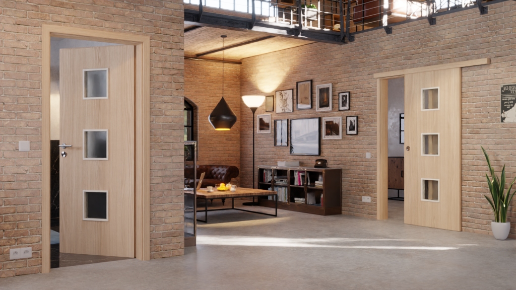 Odporne na ścieranie drzwi przesuwne z prowadnicą podłogową oraz muszlą uchwytową: