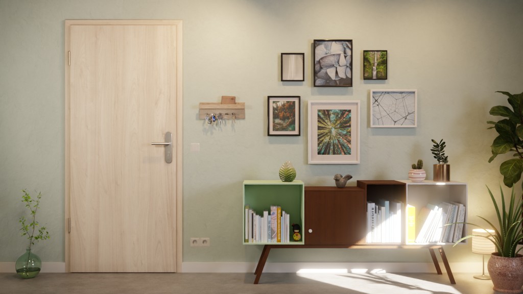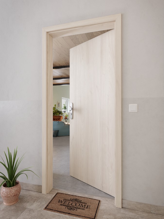 Oprócz 3 mm grubej płyty wierzchniej, pełny rdzeń zapewnia odporność na uderzenia. Skrzydło drzwiowe pewnie osadzone jest w ościeżnicy dzięki trójczłonowym zawiasom. Standardowa dostawa obejmuje również zamek cylindryczny profilowy oraz opadające uszczelnienie podłogowe.
