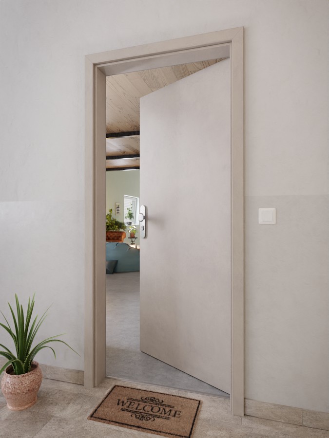 W rdzeniu skrzydła drzwi znajduje się płyta wiórowa, która w połączeniu z 3 mm grubą okładziną zapewnia wysoką stabilność modelu. Trzyczęściowe zawiasy gwarantują niezawodne mocowanie w ramie. Oprócz zamka cylindrycznego w zestawie znajduje się obniżana uszczelka podłogowa.