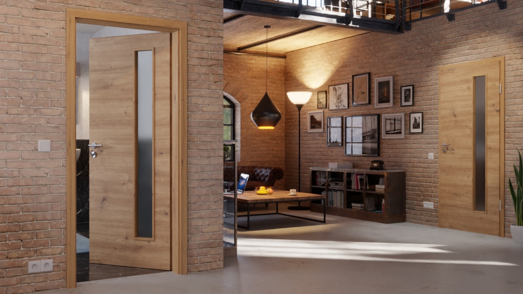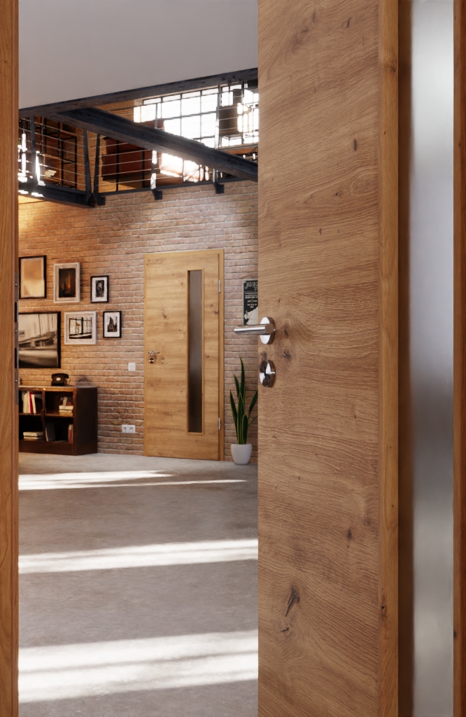 Rdzeń z płyty wiórowej stanowi stabilną podstawę, podczas gdy 3 mm grubości płyta wierzchnia zapewnia solidne wykończenie drzwi wewnętrznych o klasie obciążenia S. Zamek wielozadaniowy i dwuczęściowe zawiasy są częścią zestawu.