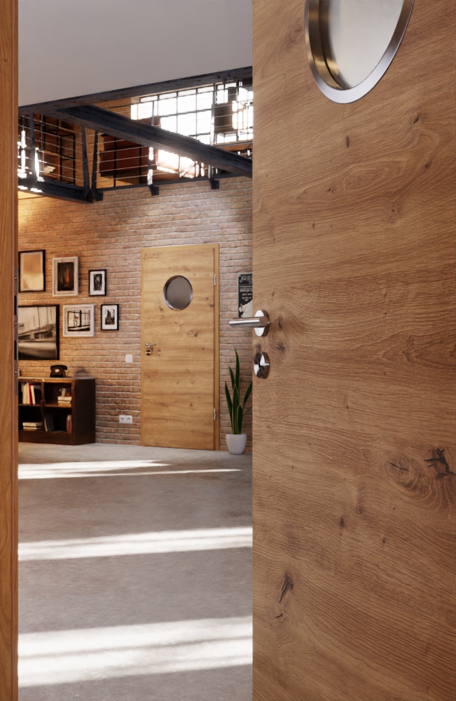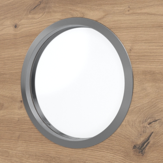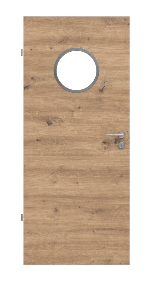 Dzięki rocznym pierścieniom i dziurom po gałęziach, brązowe wykończenie CPL uzyskuje autentyczny wyraz. Łatwa pielęgnacja zapewnia wysoką odporność na rozpuszczalniki i wilgoć. Okrągłe okno szklane w górnej części skrzydła drzwi przypomina bulaj statku.