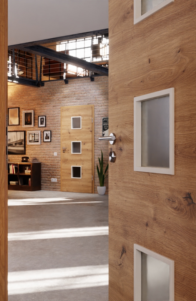 Linie rocznych słojów i sęki kształtują design brązowego dekoru CPL. Wysoka funkcjonalność codzienna gwarantowana jest przez odporność na rozpuszczalniki i wilgoć. Dzięki trzem przeszkleniom światło przenika do Twoich pomieszczeń.