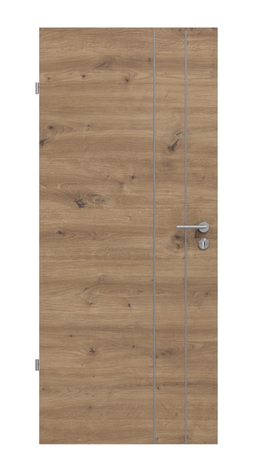 Dzięki sękom i liniom rocznym brązowa dekoracja drewna zyskuje autentyczny wyraz. Po stronie zamka znajdują się dwa poziome liseny, które nadają modelowi nowoczesny charakter.