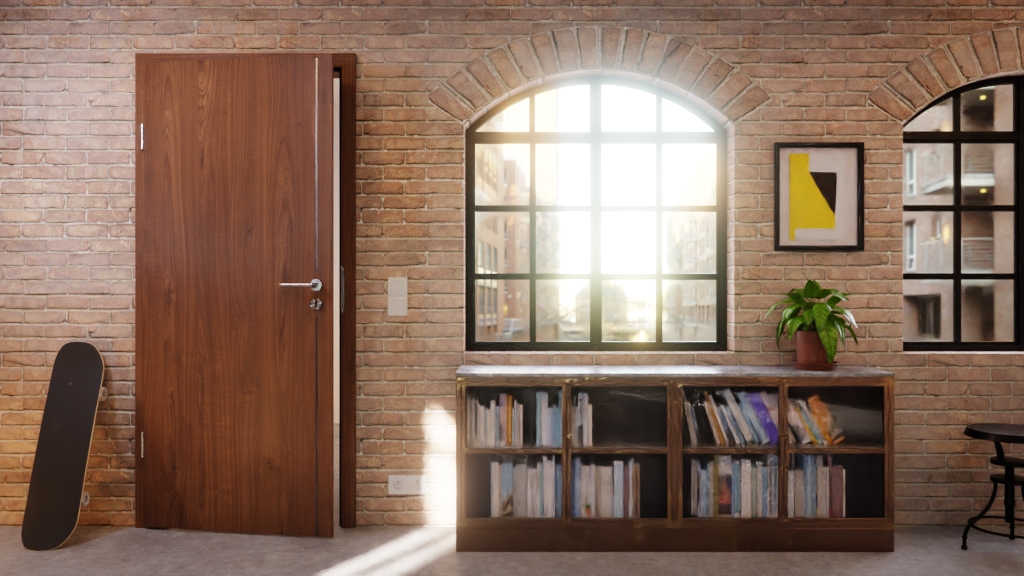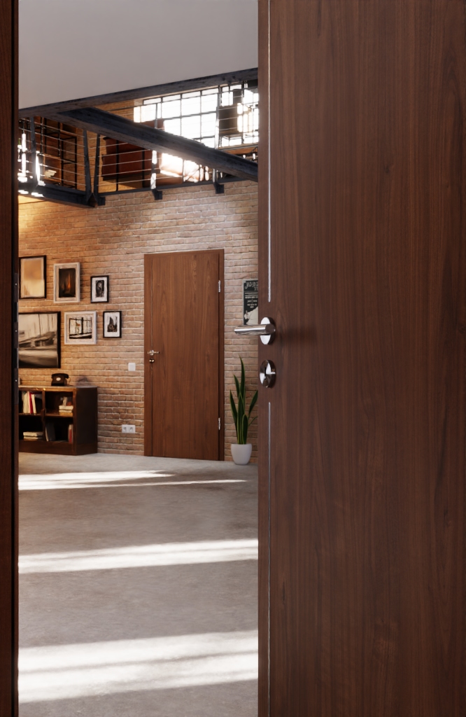 Kwadratowe skrzydło drzwiowe wyposażone jest w rdzeń z płyty wiórowej oraz 3 mm grubą okładzinę. Solidny charakter odzwierciedla się w klasyfikacji klasy obciążenia S. Aby skrzydło drzwiowe pewnie osiadało w ramie, standardowa dostawa obejmuje oprócz zamka z wieloma kluczami dwuczęściowe zawiasy.
