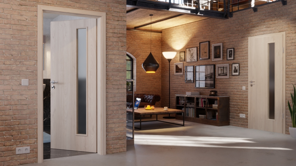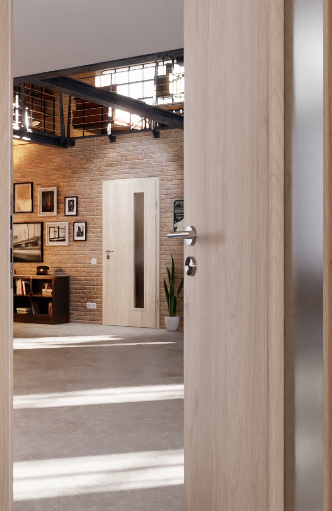 Prostokątne skrzydło drzwiowe wyposażone jest w płytę rurową w rdzeniu oraz 3 mm grubą płytę wierzchnią. Solidny charakter odzwierciedla się w klasie obciążenia S. Już w standardzie otrzymujesz zamek wielozadaniowy oraz dwuczęściowe zawiasy.