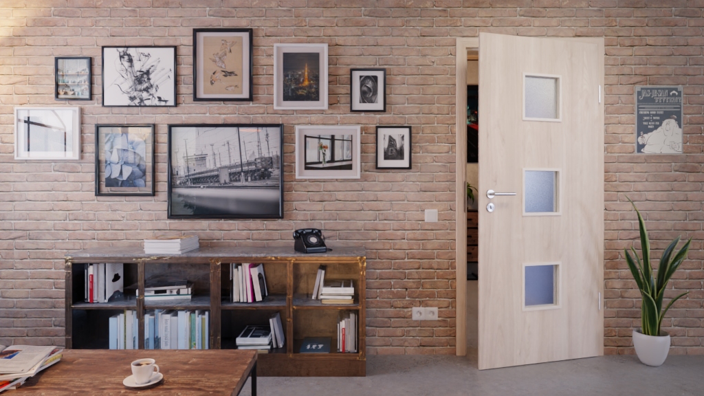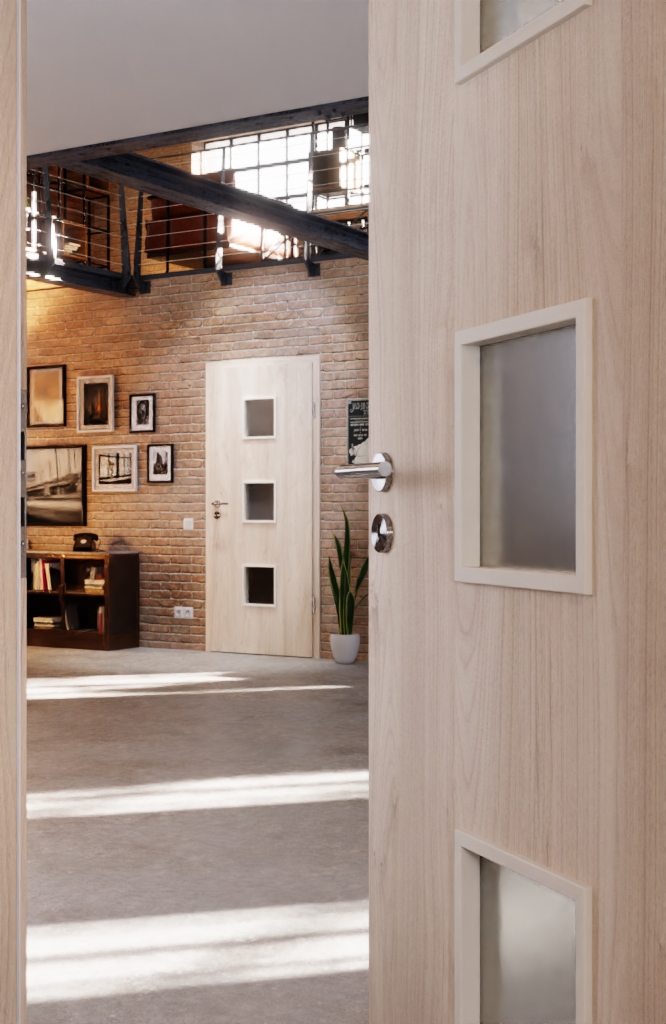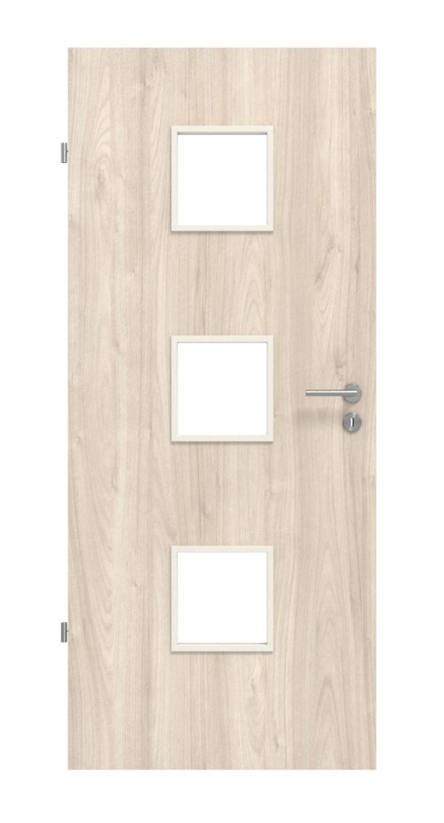 Autentyczna dekoracja drewniana zachwyca właściwościami odpornymi na zarysowania, ścieranie i uderzenia. Wysoką funkcjonalność na co dzień zapewnia odporność na rozpuszczalniki i wilgoć. W skrzydle drzwi umieszczono trzy przeszklenia.