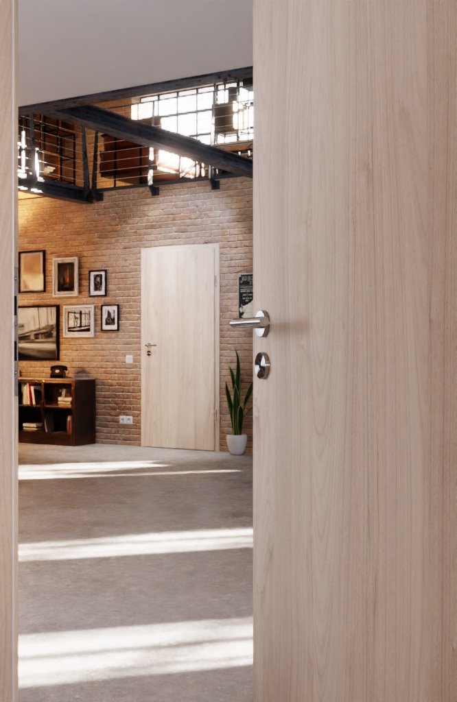 Rdzeń z płyty wiórowej stanowi stabilną podstawę, podczas gdy 3 mm grubości płyta wierzchnia zapewnia solidne wykończenie drzwi wewnętrznych o klasie obciążenia S. Dwuczęściowe zawiasy i zamek wielozadaniowy są częścią standardowego wyposażenia.