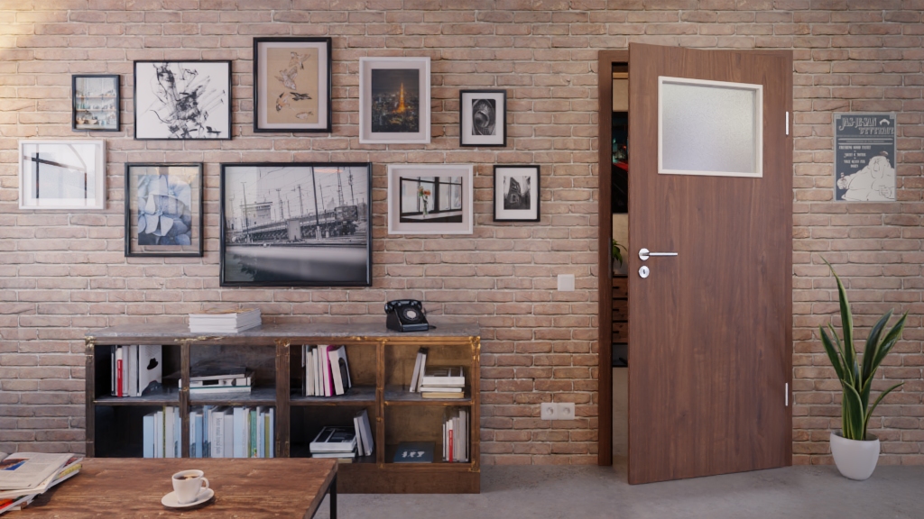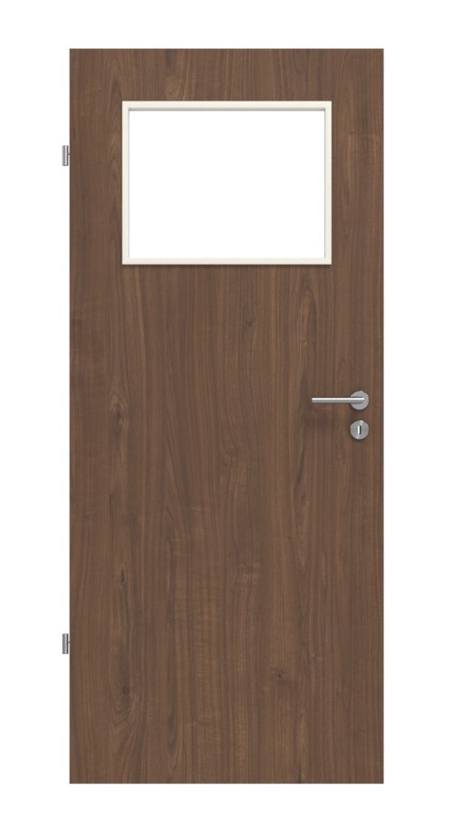 Ciemnobrązowa dekoracja z drewna charakteryzuje się sękami i liniami rocznymi. Abyś mógł długo cieszyć się naturalnym wyglądem modelu, zarysowania i ścieranie powłoki nie mają znaczenia. W górnej części skrzydła drzwi znajduje się prostokątny otwór świetlny.