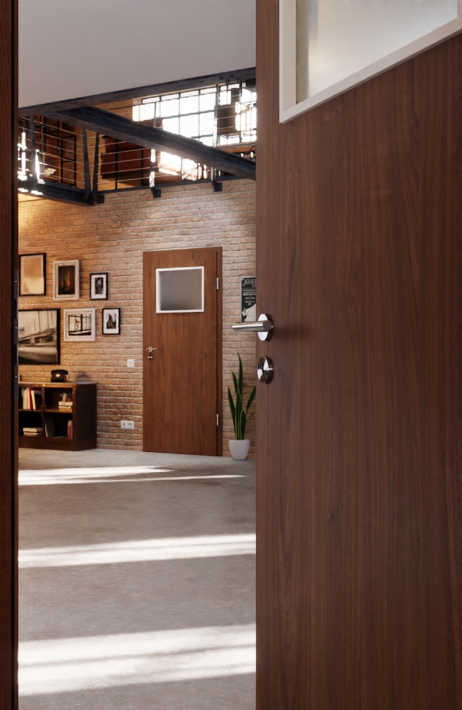 Podczas gdy 3 mm gruba płyta wierzchnia zapewnia stabilne wykończenie, płyta wiórowa w rdzeniu zwiększa stabilność. Solidna konstrukcja osiąga wysoką odporność klasy S. Aby skrzydło drzwiowe pewnie osadziło się w ramie, standardowa dostawa obejmuje oprócz zamka wielozadaniowego dwuczęściowe zawiasy.