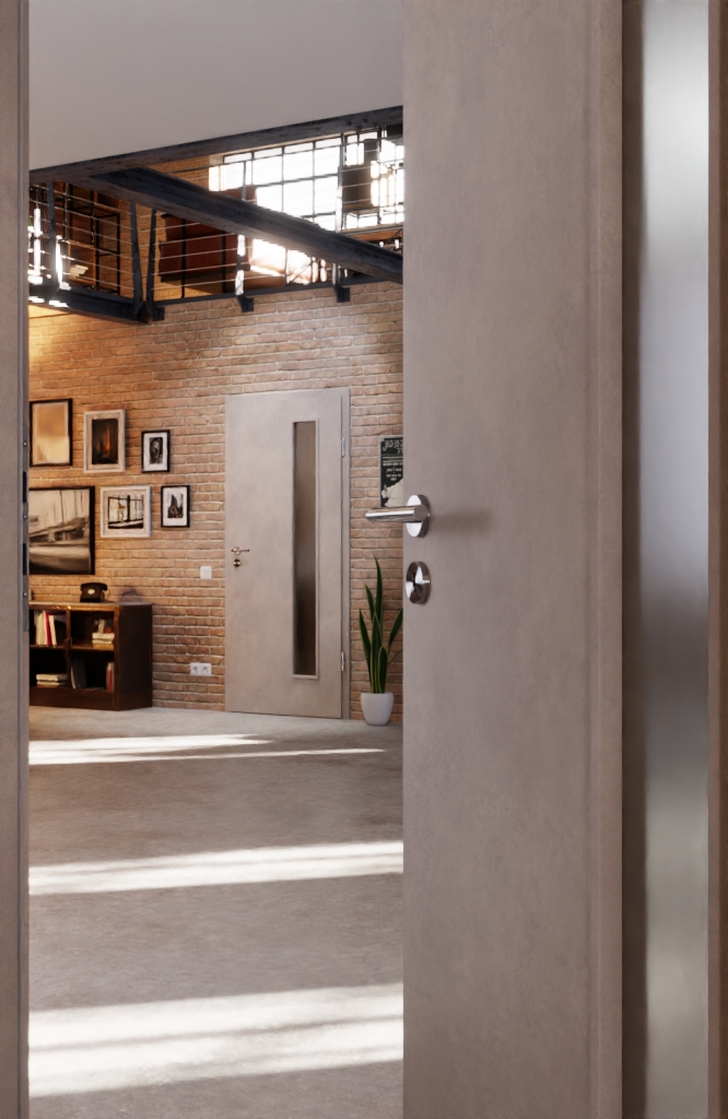 Prostokątne skrzydło drzwiowe wyposażone jest w rdzeń z płyty rurkowej oraz 3 mm grubą płytę wierzchnią. Solidny charakter odzwierciedla się w klasyfikacji klasy obciążenia S. Oprócz zamka wielozadaniowego, dwuczęściowe zawiasy są standardowym wyposażeniem.